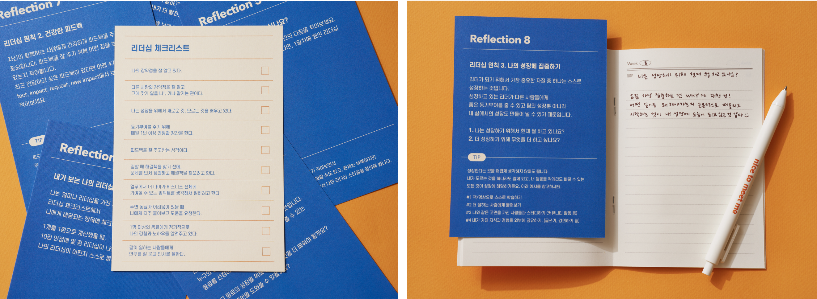 리더십 워크숍의 결과물을 책자로 정리하거나, 2~3주간의 온라인 리추얼 기간 동안 리더 개개인이 작성한 콘텐츠를 개별 책자로 제공합니다. 평소 바쁜 일정으로 스스로를 잘 돌보기 힘든 리더들이 프로그램을 통해 스스로를 관찰할 수 있는 시간을 가지고, 그 결과물을 책으로 정리하여 언제든 들여다볼 수 있도록 제공합니다. 리더로서 스스로의 생각을 정리하고, 자부심을 가질 수 있습니다.